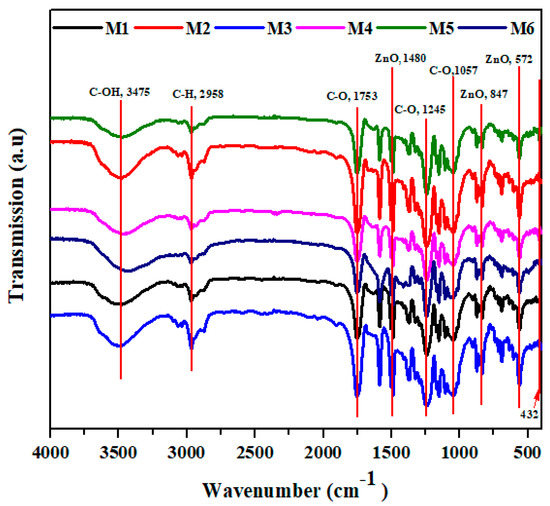 Figure 7 shows the FTIR spectra of all developed membranes. The main peaks at 3475 cm−1 are attributed to C–OH vibration; peaks at 753 cm−1 are attributed to aromatic ring stretching; peaks at 1480 cm−1 are attributed to aromatic semi-ring stretching. Furthermore, the symmetric stretching of S–O appeared at 1057 cm−1 that is present in polysulfone polymer [9]. The core and shell (M1) membrane shows an absorption band between 400 and 700 cm−1 which refers to Si–O–Si. Moreover, bands at 3425 and 1700 cm−1 are attributed to the adsorbed water due to the hydrophilic nature of the nanoparticles [35,36,37]. In addition, membranes with CA have characteristic peaks at 3500 cm−1 which refer to –OH, at 2963.4 cm−1 attributed to –C–H bond, at 1750 cm−1 corresponding to C–O, and at 1236 and 1044 cm−1 to –C–O– [38]. Furthermore, the M2 and M3 membranes have characteristic bands at 460 cm−1 that prove the presence of ZnO NPs. The presence of ZnO NP vibration has a peak at 460 and 1749.66 cm−1; these peaks are attributed to water adsorbtion on ZnO nanoparticles. Additional peaks of ZnO are observed at 565.44, 827.18, 1384, and 1582.07 cm−1 [39]. Moreover, the resulting bands between 3500 and 3000 cm−1 are assigned to the stretching band of (-OH) and bending vibration of (H-O-H) in water molecules. Additional absorption of the hydroxyl bands on the surface was observed at 1638 cm−1. A similar result was obtained at treated membranes (M4 to M6) with decreasing intensity after treated with sodium hydroxide.