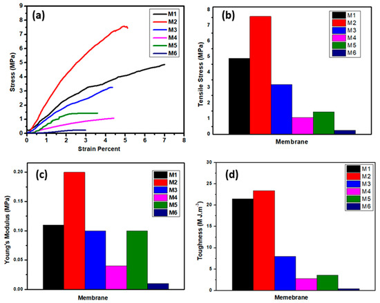 Membranes’ mechanical properties: (a) stress–strain curve, (b) tensile stress, (c) Young’s modulus, and (d) toughness of the different membranes.