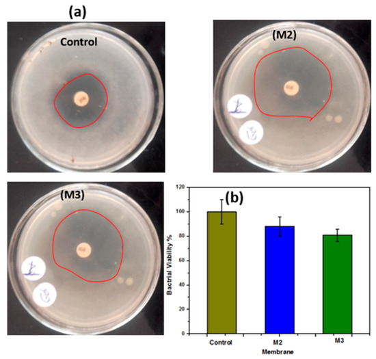 The antibacterial activity of the electrospun membranes was evaluated using E. coli. Results show that the manufactured membranes elucidated antimicrobial activity against E. coli. Figure 9a shows antibacterial activity against E. coli based on zone inhibitors from M2 and M3 nanofiber membranes which embeded with ZnO NPs, even in the core or shell. It is suggested that PSf–CA coaxial nanofiber membranes containing ZnO NPs located on the nanofibers’ outer surface hung on the bactrial cell wall and thus resulting in cell membrane incursion [41]. In addition, membranes that contain ZnO resulted in additional antibacterial properties [42]. These results were also confirmed by spectrophotometric analysis. Spectrophotometric analysis is displayed in Figure 9b; the results show that the M2 and M3 membranes have the ability to destroy 12% and 19% of E. coli bacteria, respectively. The mechanism of antibacterial properties of ZnO NPs is attributed to several reasons which include: (a) interaction of ZnO NPs with the microorganisms and (b) release of antimcrobial ions. As a result of that, damage of bacterial cells happens, and this was also due to the light radiation causing a reactive oxygen species (ROS). The ROS caused a presence of hydroxyl radicals (OH·), hydrogen peroxides (H2O2), and superoxide anion (O2) which resulted from the reactive oxygen species [43,44,45,46].