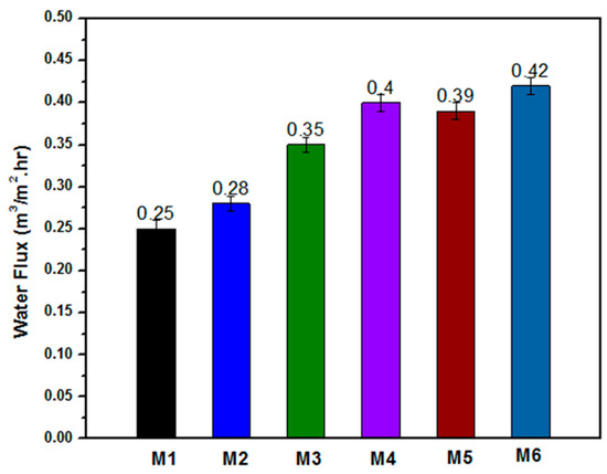 Water flux of the different membranes (M1 to M6); results show water flux increase in treatment membranes.