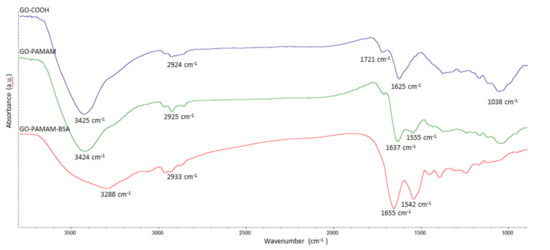 The FTIR spectral results of the synthesized materials are displayed in Figure 1. Signals at 1721 and 1038 cm⁻1 from the GO-COOH sample were attributed to the C=O and C–O, respectively [33,34] stretching vibrations of –COOH groups. The 1625 cm⁻1 band was attributed to COO– symmetric vibration and the 2924 cm⁻1 signal was given by C-H stretching vibration. The broad band at 3425 cm⁻1 corresponded to O-H bonds’ stretching vibrations [31]. After functionalization with PAMAM, the FTIR spectra of the newly formed complex (GO-PAMAM) revealed the covalent linkage between the GO sheets and the dendrimer. The new signal at 1555 cm⁻1 and the shift of the 1625 cm⁻1 peak to 1637 cm⁻1 were attributed to amidic in-plane N–H bend [35] and amidic C=O stretching vibration, respectively [36].