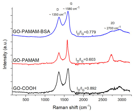 To study the formation of the new materials, the Raman spectra for GO-COOH, GO-PAMAM and GO-PAMAM-BSA were compared (Figure 3). All the samples displayed the D and G characteristic bands at ~1350 and ~1580 cm⁻1. Moreover, a broad 2D band has appeared at the ~2700 cm⁻1 region of the GO-PAMAM-BSA Raman spectrum.