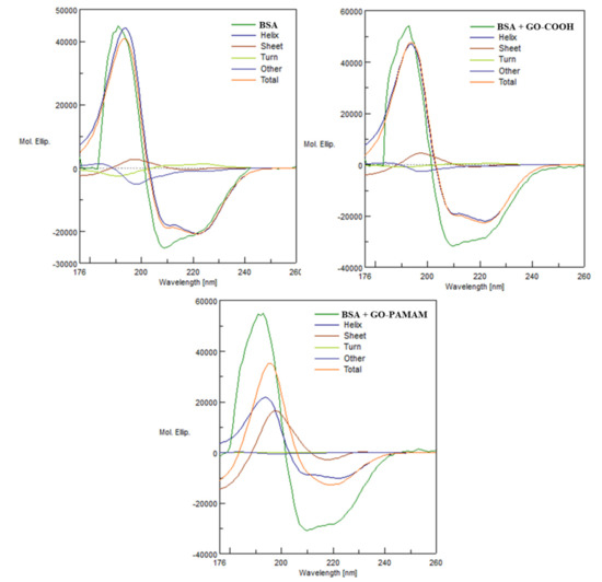 In order to study the influence of the modified GO upon the protein structural integrity, CD analyses were performed for 1:1 (wt) mixture of BSA with previously synthesized GO-COOH and GO-PAMAM. The measurements were done after the components were brought in contact for 1.5 h. Spectral curves for native BSA, GO-COOH:BSA and GO-PAMAM:BSA and the results of each deconvolution into pure secondary structural components, with respect to their proportion are depicted in Figure 6. All the CD spectra exhibited a positive signal at around 192 nm, and two negative ones at 210 and 225 nm. This was the classical α-helix spectral shape obtained from circular dichroism spectrometry, denoting the significant presence of α-helix structure in the protein conformation [44].