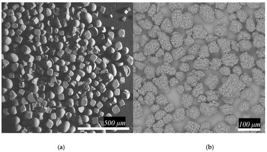 Porous samples were prepared from UHMWPE powder (average molecular weight ~ 5 × 106 g/mol, particle shape ~ spherical, average particle size ~ 200 μm) with the trademark GUR 4120 of Ticona GmbH production (Oberhausen, Germany) in combination with usual table salt (particle shape ~ quasi-cubic, average particle size ~ 250 μm) of LLC Salina production (Rostov, Russia) that were obtained as supplied. The structure and morphological characteristics of used powders are illustrated in Figure 1.