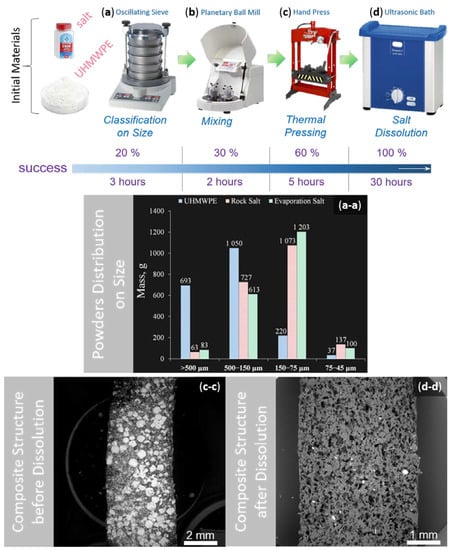 The methodological process for porous sample preparation based on UHMWPE: (a) UHMWPE and salt powders classification on size and obtained particles size distributions (a-a); (b) Mixing of extracting powders in the necessary proportion; (c) Thermal pressing of achieved mixture and observed composite structure (c-c); (d) Desalination process and achieved polymer porous structure (d-d).