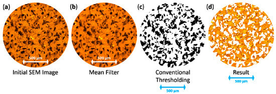 2D-surface analysis was carried out using the open-source advanced ImageJ software [], namely, the combination of a mean filter with a radius of 10 pixels and a traditional thresholding tool for segmentation, as shown in Figure 3. Statistical information like area, perimeter, circularity and Feret parameters of pores was extracted.