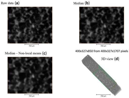 The visualization, cropping, and analysis of the 3D dataset was done using Avizo v2020 software (Thermo Fisher Scientific) []. The initial dataset was cropped to 400 × 327 × 1707 pixels and then a subregion was extracted 400 × 327 × 850 pixels (2280.5 × 1863.3 × 4852.5 µm). This dataset was reconstructed with a voxel size of 5.7 × 5.7 × 5.7 µm, which was filtered using a median and non-local means filter which were applied in 3D to reduce noise as shown in Figure 4. The material was segmented using interactive thresholding, which binarised the data over a chosen range of intensity. The pore region of the processed data set was extracted by inverting the pixel values and the thickness of the pores was computed using a thickness map module. This technique determines the maximum diameter of a sphere that fits the volume analysed and is based on the work of Hildebrand et al. []. The true Euclidean distance metric was computed, and the distance field was also analysed. Finally the 3D computation of connected voxels was performed to extract statistical details such as volume, width, length, 3D Feretshape, etc.