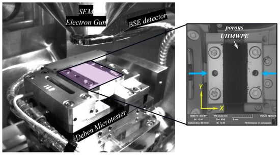The compression test was carried out inside the chamber of Scanning Electron Microscope (SEM) Tescan Vega 3 (Tescan, Brno, Czech Republic) using a 1 kN Deben Microtest load cell (Deben Ltd., London, UK). The experiment was performed using a constant displacement rate of 1.5 mm/min, and the system was synchronized with of the SEM image acquisition. A backscattered-electron (BSE) detector was used to collect images at an acceleration voltage of 30 kV, image time of 4 s under low-vacuum (~20 Pa) conditions. Three rectangular bars of the porous UHMWPE (20 × 10 × 10 mm3) were compressed according to the ASTM 1621 []. The experimental setup is shown in Figure 5.