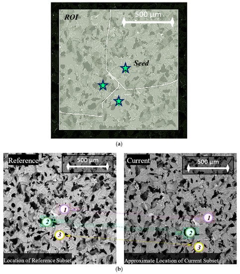 The DIC analysis was performed for 83 SEM images acquired during the in-situ compression test using the open-source Ncorr MATLAB package []. A region of interest (ROI) was selected such that a significant portion of the porous sample was visible without considering the unstable boundary effects. The DIC parameters subset radius and subset spacing were set to 60 pixels and 3 pixels, respectively. These values were chosen such that Ncorr could best recognize the different regions of foam, and accurately predict seed movement between images. The multithreading option, which corresponds to the number of seeds, was set to three threads. Before the DIC analysis was carried out, the seeds were strategically placed in the ROI for parallel processing. To acquire the ideal seed placement, an iterative approach was taken. Two requirements were considered when relocating seeds during the iterations. The first requirement was that each seed remained within the field of view of all SEM images. The second requirement was that the movement of each seed between consecutive images should not be erratic. The final placement of the seeds is shown in Figure 7.