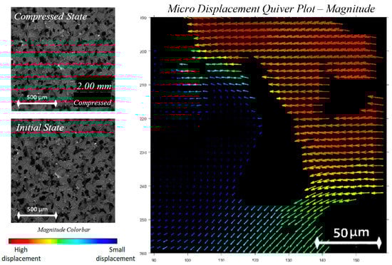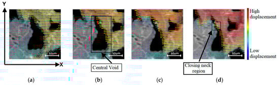 The micro-scale compression is visible from observation of the raw foam image, as well as the superimposed displacement vectors from obtained Ncorr data. From image observation alone, the void is expected and observed to become smaller parallel to the X-axis, and to stretch along the Y-axis, with a closing neck region clearly visible in Figure 13d.