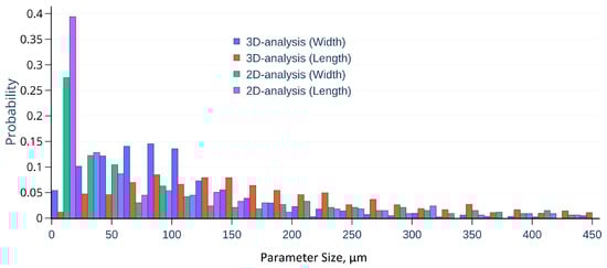 2D-analysis of SEM images by ImageJ showed a porosity value of about ~34.90%, with an average pore width ~150 μm and length ~80 μm, while 3D analysis of X-Ray Tomography data in Avizo only reached ~9.17 vol.% porosity and high values of pore characteristics, with width ~100 μm, and length ~220 μm according to the histograms illustrated in Figure 10.