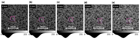 Movement of structural characteristics during compression with plotted intensity distribution histogram below for (a) 0 mm; (b) 2 mm; (c) 4 mm; (d) 6 mm; and (e) 8 mm compression steps, respectively.