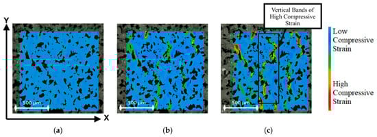 Macro analysis of foam behaviour under compression was obtained from the Ncorr strain data and is displayed in a heatmap configuration in Figure 12. These heat maps indicate how the blue regions of low compressive strain develop into select red areas of high compressive strain greater in magnitude than –0.7. As the foam is compressed, vertical bands of connected regions undergoing high compressive strain become evident, as shown in Figure 12c. The compressive bands arise in a pattern, which links voids that are close together and result from the internal geometry and structure of the foam. The material near a gap can displace into the free space and propagate the high strain regions between voids by cell-edge bending.