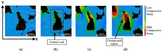 This is confirmed through a void area analysis in Figure 15, which shows the reduction in area and how the neck region did indeed close first. As the void continues to compress along the X-axis, the high strain region encompasses more of the cell walls under direct load, while the top and bottom cell walls of the void remain at a lower compressive strain and even link up with the compressive band of a nearby void as shown in Figure 14d. In the final image, the vertical cell walls of the void are clearly under high compressive strain, especially in the closing neck of the void, while the adjacent solid also displays higher compressive strain.
