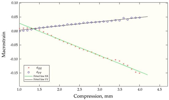 Plot of DIC obtained strain values against compression for analysis and Poisson’s ratio calculation.