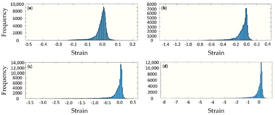 The present results illustrate that even under overall elastic deformation that reaches larger values in porous materials considered in the present study, strain histograms tend to evolve from symmetric normal to asymmetric lognormal distributions, as illustrated in Figure 17a–d.