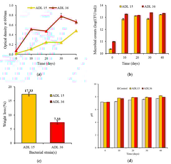 Biodegradation of plastics is primarily influenced by environmental factors such as pH, as pH has a profound influence on the survival of microbes and the success of the hydrolytic cleaving of the “microwastes” [,]. Figure 1d shows the pH changes of the BH media infused with PP microplastic during the 40 days of incubation with Antarctic bacterial strains. The changes in the pH for the liquid medium inoculated by the two strains increased from neutral to slightly alkaline along the incubation period, although there were bacterial growth inconsistencies. Although there is no definite comprehension of the pH increment during the course of polymer degradation, the continuous increase of pH towards the alkaline state is believed to happen because of the production and accumulation of oligomers and intermediate products via the action of bacterial exoenzymes []. From the 0th to 40th day, the pH progressed from 7.12 to 8.17 for ADL15 and 7.17 to 7.94 for ADL36. The optimum growth of ADL36 (OD600 = 0.776, 13.39 log CFU/mL) was achieved on the 30th day when the pH was 7.89, whereas ADL15 (OD600 = 0.481, 13.22 log CFU/mL) achieved optimal growth on the 40th day when the pH reached 8.17. While a further increase in the pH (7.89 to 7.94) in the last 10 incubation days led to the decrease in the growth of ADL36, the growth reduction appears to be insignificant (p > 0.05) (Figure 1a). As for ADL15, since the optimal pH growth was on the 40th day, further incubation of the bacteria might be required to observe the trend between the bacterial growth and pH of media.