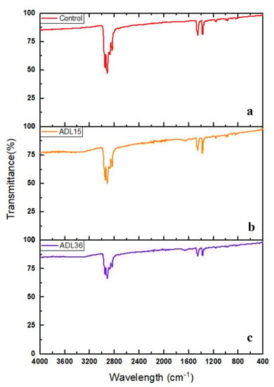 The infrared spectroscopic analyses were performed on Spectrum 100 1FTIR spectrometer (PerkinElmer, Waltham, MA, USA) with the 5 mg polymer sample dispersed in pellets of KBr to elucidate the types of chemical bonds (functional groups). The measurements were conducted within the 4000–400 cm−1 wave number. The normalised intensity of the functional groups was determined based on the transmittance (%). Analyses were conducted on both PP microplastic samples incubated with ADL15 and ADL36 and on the uninoculated control PP microplastic samples.
