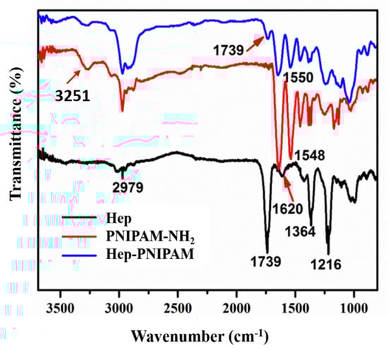 FTIR spectrum of heparin (Hep) (black), amino-terminated poly(N-isopropylacrylamide) (PNIPAM-NH2) (red), and Hep-PNIPAM (copolymer) (blue).