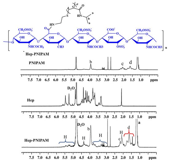 The chemical structures of heparin, PNIPAM-NH2, and the copolymer were predicted from the FTIR spectra. As shown in Figure 1, the heparin spectrum (black) showed peaks at 2979 cm−1 (−CH stretch), 1739 cm−1 (−COO−) and 1216 cm−1 (−CO stretch). These values confirmed the basic heparin structure. The amino-terminated PNIPAM-NH2 spectrum (red) showed functional group peaks at 2979 cm−1 and at 1548 cm−1 attributable to (−CH3) stretching and the PNIPAM-NH2 amide II bonds, respectively. The peak at 3251 cm−1 for PNIPAM-NH2 represented the substituted amine functional group’s stretching vibration. The functional peak of Hep-PNIPAM (−COO−) stretching at ~1739 cm−1 was lower than that of heparin. Thus, PNIPAM-NH2 was coupled to heparin [,]. The 1H NMR for the copolymer (Figure 2) showed characteristic PNIPAM peaks at a (δ = 1.20 ppm), d (δ = 1.7 ppm), and b (δ = 4.00 ppm), and for heparin at H (δ = 2.1 ppm, 3.5 ppm, and 4.4 ppm). The FTIR spectrum and the 1H NMR proved that Hep-PNIPAM was successfully synthesized. The number-average molecular weight (Mn) and the dispersity (Đ) for PNIPAM-NH2 were also evaluated by gel permeation chromatography (GPC). According to the result, the molecular weight was 11,230 g/mol with a narrow dispersity (Đ) (1.106), which further confirmed the polymerization of the copolymer (Supplementary Materials Figure S1).
