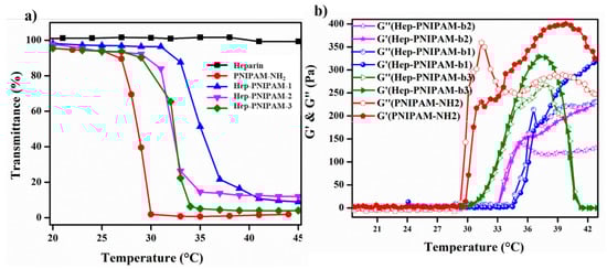(a) Temperature-dependent transmittance for aqueous solutions of heparin, PNIPAM-NH2, and copolymers with various PNIPAM grafting ratios on heparin. (b) Storage modulus G’ and loss modulus G” as functions of temperature for PNIPAM and heparin copolymers grafted with different PNIPAM ratios.