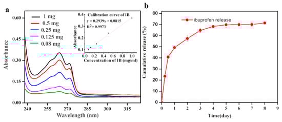 Several studies reported that ibuprofen powerfully modulates wound healing [,]. Ibuprofen is a commonly used NSAID to treat acute pain, inflammation, and degenerative diseases. Ibuprofen was encapsulated in the Hep-PNIPAM hydrogel by simple mixing. In vitro drug release behavior in phosphate-buffered saline PBS (pH 7.4) was explored. Ibuprofen was released mainly by diffusion and was followed by hydrogel erosion. The ibuprofen release profiles from the Hep-PNIPAM hydrogels are shown in Figure 4b. The amount of ibuprofen released was measured at 264 nm by UV spectrophotometry using the interpolation of a free ibuprofen calibration curve (Figure 4a) []. As ibuprofen is an NSAID, its efficacy is vital during the inflammatory phase of healing. The drug release curve revealed that sustained ibuprofen release lasted for 1 week, and the cumulative release was ~70%. The drug release was rapid within the first 8 h (~15%), which indicated a light burst release pattern that is effective in acute inflammation and pain treatment.