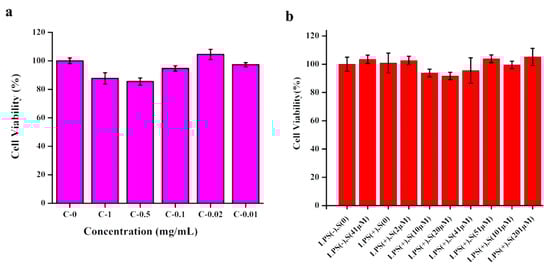 To evaluate the cytotoxicity of Hep-PNIPAM on HaCaT cell lines and RAW264.7 cell lines, an MTT assay was performed as described in previous studies [,,,]. Briefly, HaCaT cells and RAW264.7 cells were seeded in a 96-well plate at a density of 1 × 104 cells/well. The cells were cultured in DMEM containing 10% (v/v) FBS, 1% (w/v) sodium pyruvate, and 1% (w/v) streptomycin at 37 °C in a humidified atmosphere with 5% CO2. After 24 h, the culture medium was removed and the cells were washed twice with PBS. Serial dilutions of Hep-PNIPAM (control (0), 1, 0.5, 0.1, 0.02, and 0.01 mgmL−1) were prepared with fresh media, and added to the cells, which were then incubated for another 24 h. The cells were then washed with PBS and 20 μL MTT solution (5 mgmL−1 in PBS) was added to each well along with 100 μL culture medium. The cells were incubated for an additional 4 h, after which the MTT solution was discarded and 100 μL dimethyl sulfoxide (DMSO) was added to solubilize the formazan crystals and measure its absorbance at 570 nm via an enzyme-linked immunosorbent assay (ELISA). The viability of the RAW264.7 cells was determined after subjecting them to varying concentrations of IB-Hep-PNIPAM in the presence or absence of 1 μgmL−1 LPS for 24 h. Absorbance at 570 nm was measured via a microplate reader (ThermoMultiskan FC microplate photometer; Thermo Fisher Scientific, Waltham, MA, USA). Cell viability (%) was calculated according to Equation (4).