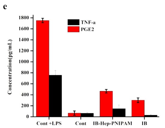 RAW264.7 cells were seeded in 24-well plates and subjected to 10 wt. % Hep-PNIPAM loaded with serial dilutions of ibuprofen (IB-Hep-PNIPAM), 20 μM IB-loaded Hep-PNIPAM, and 20 μM free IB for 1 h followed by incubation with 1 μgmL−1 LPS for 24 h at 37 °C under 5% CO2. The PGE2 and TNF-α levels in the culture medium were determined by ELISA (Thermo Fisher Scientific, Taipei City, Taiwan) according to the manufacturer’s instructions.