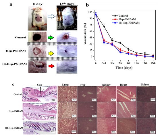 Wounds treated with Hep-PNIPAM, IB-Hep-PNIPAM, and PBS (control group). (a) Hydrogel administration and wound recovery from days 1–15, (b) Relative wound healing rates in mice treated with Hep-PNIPAM, IB-Hep-PNIPAM, and PBS. Data are represented as means ± SD. (c) Histological observations of wounded skin and organ sections stained with H&E and examined on day 15. Bars = 50 μm. * = granulation in the dermis.