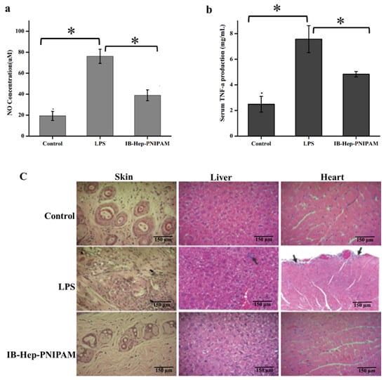 Effects of IB-Hep-PNIPAM on LPS-induced (a) NO and (b) TNF-α production. Data are presented as means ± SD for three independent experiments. * p < 0.05 compared with the untreated LPS group. (c) Histological observations of wounded skin, liver, and heart tissues stained with H&E. Bars = 150 μm. The arrows show the infiltration of inflammatory cells.