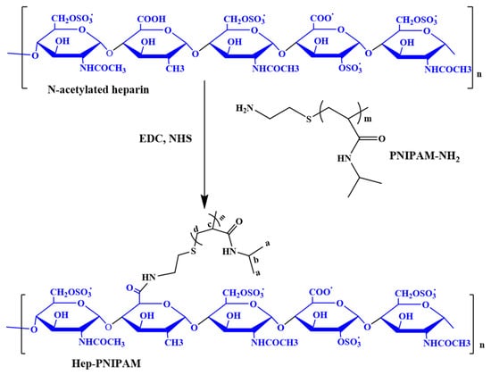 To synthesize the PNIPAM-grafted heparin copolymer (100 mg; 0.18 mmol COOH in terms of repeating units), N-acetylated heparin was dissolved in 10 mL 0.1 M MES buffer (pH 5.6). The carboxyl group of the heparin was activated with excess EDC and NHS for 8 h at 25 °C (Scheme 1). PNIPAM-NH2 (1.5 g, 2 g, and 3 g per group) was then added and the reaction was performed at room temperature with stirring for 24 h. The grafting solution was purified by thermally induced precipitation at 50 °C, dialyzed (molecular weight cutoff (MWCO = 12–14 kDa) with distilled water for 4 days, and lyophilized [,,].