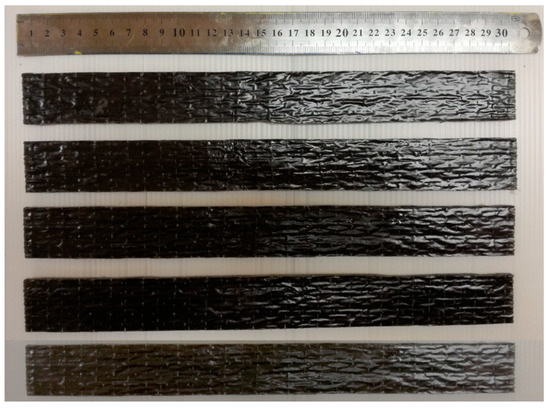 Initially, unmodified and nanomodified epoxy resin was prepared using the Miracast 1517 epoxy resin. For the unmodified epoxy to be used reinforced with fiber, the epoxy (Part A) was weighed according to the amount required and then mixed with hardener (Part B). For the nanomodified epoxy resin, ethanol was used as the solvent to disperse the GNP, meanwhile, nanosilica was dispersed using the mechanical stirrer. The BF and GF fabrics were cut according to the required dimensions. The unmodified and nanomodified epoxies were weighted according to the required final specimen’s size. The hardener was then added into the epoxy resin at room temperature. Hand lay-up and vacuum bagging method were adopted in the fabrication process, starting with a layer of resin, alternating with a layer of fiber fabric and ending with a layer of resin again until the required thickness had been achieved. Once the thickness was achieved, a perforated release film was put on top of the laminate to allow the excessive resin to pass through followed by absorption by the absorption fabric. The vacuum bagging film was then placed on top of the laminate and pressed firmly against the sealant tape to provide a tight vacuum system with the proper spread as this would result in the formation of wrinkles that would affect the surface finish of the laminate. Finally, the laminate was vacuumed for an hour to remove any air trapped, bubbles and excessive resin before left to cure at room temperature for 24 h. A total of five samples per group of FRP composites were fabricated for testing purposes. Figure 1 shows the example of fabricated unmodified BFRP composite samples. Table 1 lists the details and labels used to represent the samples.