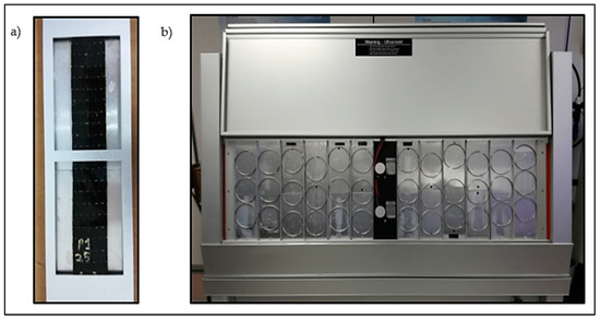 (a) Specimen mounted on the specimen holder, (b) setup of the specimen holder arrangement in the accelerated weather testing chamber.
