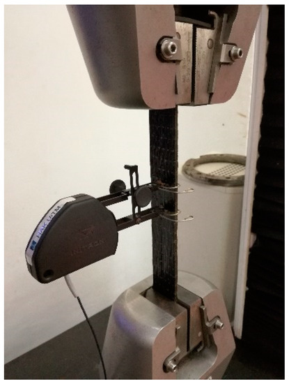 The tensile behavior of conditioned and unconditioned BFRP and GFRP samples were tested under tensile loading following ASTM D3039. The composite samples with 200 mm length, 25 mm width and 2 mm thickness were prepared. The test was conducted using 3382 Universal Testing Machine 100 kN load cell (Instron, Norwood, MA, USA 2008) with the crosshead speed of 2 mm/min. Tensile properties data were acquired from a universal testing machine and the setup is shown in Figure 3. At least five specimens were tested for each system.
