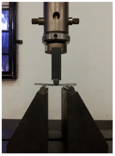 The flexural test was conducted according to ASTM D790 under the three-point bending test configuration as shown in Figure 4. A rectangular sample with a size of 80 mm length, 13 mm width and 3 mm thickness was prepared and the span length to thickness ratio was maintained at 16:1. A 100 kN Universal Testing Machine with the crosshead speed of 2 mm/min was used to perform the flexural test on the exposed and unexposed BFRP and GFRP samples. The flexural strength was calculated using the following equation: