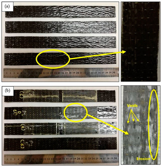 Overall surface of unmodified BFRP composites (a) unconditioned, (b) conditioned specimens.