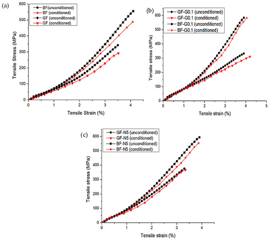Tensile stress−strain response of unmodified and nanomodified specimens for conditioned and unconditioned systems of (a) unmodified FRP composites, (b) GNP modified FRP composites, and (c) Nanosilica modified FRP composites.