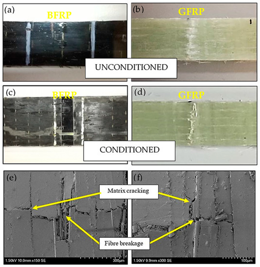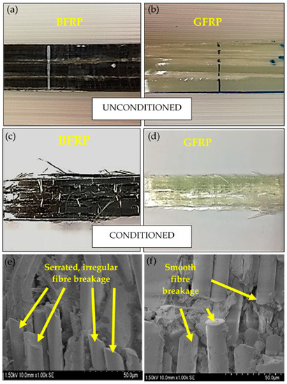In order to analyze the condition of the specimens’ fractured surfaces, microscopic and macroscopic observation was carried out on the postfracture specimens. This was important as the proof to support the results that have been discussed in the previous section. The interfacial failure started to occur during the nonlinear deformation, where the matrix cracked and propagated along the fiber length for both BFRP and GFRP. The macroscopic observation on the BFRP and GFRP composites are shown in Figure 7. From observation, it can be seen that both types of composite material experienced a similar damage mechanism where the matrix cracked along the fiber direction; for the conditioned specimens, the fiber breakages were much more notable than the unconditioned specimens. This is supported by the macroscopic observations by Scanning Electron Microscope (SEM). From the SEM micrographs, it could be seen that the smooth surfaces of the broken glass fibers proved that it failed through brittleness. Meanwhile, the broken surface of the basalt fiber showed that this fiber failed through a combination of brittleness and ductile behavior, where the crack on the fiber tended to elongate before completely breaking. This is the reason behind the properties of basalt fiber whereby it tends to fail at a higher tensile strain and can withstand higher tensile stress until completely fractured as compared to glass fiber.
