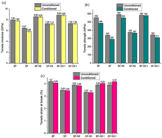 The comparison in tensile properties between the unconditioned and conditioned composites are plotted in Figure 6. From the figure, it can be observed that the loss in tensile modulus is small for the FRP composites. After exposure for 504 h to the accelerated weather conditions, the tensile modulus was reduced by 2% for unmodified BFRP and 9% for unmodified GFRP composite. The modulus of nanosilica-modified FRP composite was reduced by 0.6% for BF-N5 and 1% for GF-N5. Meanwhile, the modulus of FRP with GNP showed a reduction of 0.4% and 0.5% for BF-G0.1 and GF-G0.1 composites, respectively. The reduction in tensile modulus for the nanomodified system showed lower values than the loss for unmodified specimens, indicating that the existence of nanofiller could reduce the deterioration due to the weathering effect of the composites. A similar trend was also observed in tensile strength and strain at break, except for the tensile strain at break values for FRP-G0.1 which showed some enhancement in tensile strain. The reason behind this needs to be further investigated by conducting the accelerated weather condition test on other GNP loading. For tensile strain at break values of the accelerated weather condition specimens, it could be seen that the embrittlement of the conditioned specimens due to UV radiation resulted in a reduction in tensile strain at break. This is due to the photo-oxidation response where the diffusion of O2 in the specimen’s surface leads to microcrack formation which then propagates into the specimen and increases the surface degradation of the composites. Hence, when the specimen was tested under tensile loading, the failure originated from these microcracks resulting in larger deformation or decrement in tensile strain at break value. However, it can be seen that for BF-G0.1 and GF-G0.1 systems exposed to the accelerated conditions, the tensile strain at break values increased. This is attributed to the affinity to moisture behavior of graphene itself, where hydrophobicity of graphene depends on the thickness of the graphene layer used [34]. In this study, the GNP used was the multiple layer graphene which contributed to the hydrophobicity of the GNP, and this is proven by the data obtained in Table 2 where the moisture absorption and swelling percentage of the GNP-modified system showed the lowest values for both conditioned and unconditioned. Hence, due to the mechanism occurring during the elongation process, the GNP-modified system was able to resist the deformation and absorb much more strain energy before it broke, resulting in higher tensile strain at break values.