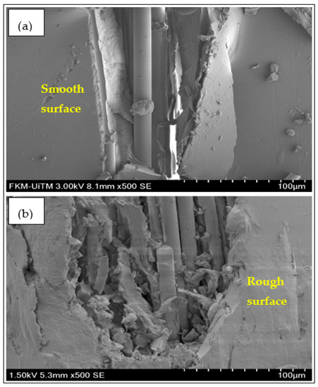 SEM micrographs of fractured unmodified BFRP composites of (a) unconditioned and (b) conditioned specimen.