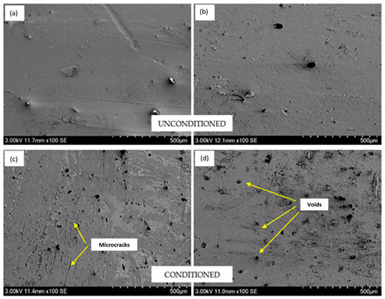 The visual observation of the tested specimens is captured in Figure 5, showing the surface of unmodified BFRP composites for conditioned and unconditioned specimens under the optical microscope. It can be seen that the composites experienced severe discoloration from blackish to a greyish color, due to the fiber and epoxy degradation after long exposure to water spraying and the UV radiation continuous cycle. Effective coatings or paints are suggested to be applied on the composites to prevent the fading effect and enhance the usefulness for exterior application [20]. Figure 5b shows that the weathered specimens experienced erosion at the edges and void formations because of the degradation mechanism due to UV and moisture response. The repetitive process of water spraying leached away a thin surface of the chemically modified epoxy layer on the composite and left the surface with a fresh layer which was then attacked by UV exposure, and the cycles are repeated, yielding a significant erosion of the BFRP composite surface. Other than that, the existence of water molecules (consists of OH and H ions) also triggered the photo-oxidation response which contributed to the fading effect. The main damage mechanism for a polymer subjected to UV radiation, called the photo-degradation mechanism, was initiated by UV photon absorption by catalyst residues, hydroperoxides, carbonyls and unsaturated molecules in the polymer. The UV photons excited states trigger the activation process in macromolecules leading to the physical and mechanical properties such as surface discoloration, loss of surface gloss, yellowing, as well as the formation of thin layer called chalking that leads to microcracking, fiber splitting and resin flaking in the composite, as illustrated in Figure 5b.