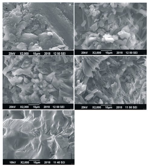 High-magnification SEM micrographs illustrated the surface morphology of uncoated and coated granular urea fertilizers (Figure 1a–e). The SEM micrograph of the uncoated urea granules showed an agglomerated structure with an uneven surface and rough patches. As a result of coating, SEM micrographs of coated urea revealed that the outer layer of coated granules was denser and smoother as compared to uncoated granules.