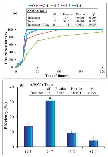 In the G-0 (uncoated urea) treatment, urea was completely released in water after 15 min and 37 s of immersion. The G-1 treatment released urea completely within 60 min and 45 s. The urea release efficiency in the G-2 treatment was the highest at 30.8%, due to the presence of paraffin wax as a binding agent. Consequently, the G-2 coating combination released urea completely within 130 min and 45 s. Our findings on the G-2 treatment were in line with a few other studies on biodegradable coating materials, where the researchers found 94% of urea was released after 120 min of its immersion in water [57,62]. On the other hand, the G-3 treatment showed 9.3% urea release efficiency. The G-4 showed the lowest efficiency (4.2%) among all. Hence, this treatment (G-4) released urea completely in water within 30 min and 21 s.