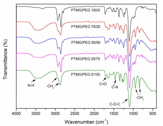 FTIR spectra of PTMG/PEG porous scaffold materials.