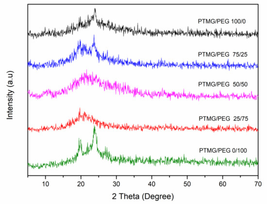 The XRD patterns of PTMG/PEG porous scaffold materials with different ratios are shown in Figure 3. The diffractograms show that both PTMG/PEG 100/0 and PTMG/PEG 0/100 were semi-crystalline structure, with two low-intensity diffraction peaks at 20° and 23°. After copolymerization, PTMG and PEG became amorphous, with only a broad diffraction band nearby 21°. As both PEG and PTMG segments are with low molecular weight, which can reduce the crystallinity of the final product during crystallization [23]. Specifically, PTMG and PEG completely reacted with HDI formatting the cross-linked bonds in the soft hard segments, as a result, the original crystal structure of PTMG and PEG was destroyed, decreasing both the mobility of the segments and their crystallization capacity.