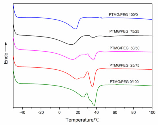 The thermal property of a polyurethane is affected by the raw materials, the proportions of the hard and soft segments, the density and type of crosslinking bonds, and the chain extender and synthesis method [24]. DSC was carried out to explore the thermal behaviors of PTMG/PEG porous materials (Figure 4). The crystallization temperature (Tcs) and enthalpies (ΔH) and other thermal characteristic results are summarized in Table 1. The wider melting from −13 to 33 °C belongs to the PTMG segment, whereas melting peak at around 36 °C belongs to the PEG segment.
