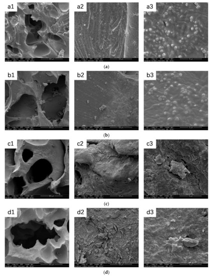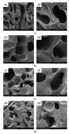 In addition to the influence of material composition for polyurethanes, synthetic preparation technology is also one of the important reasons. There are many methods for preparing polyurethane scaffolds, such as solvent casting/salt leaching, electrospinning, thermal phase separation, and gas foaming method. The pore size of the scaffold was controlled by controlling the size of the salt particles in solvent casting/salt leaching, but the connectivity of the material was reduced because of the uncontrollable removal of the salt particles in the later stage, which was not conducive to cell attachment and material transportation [17]. The electrospinning method can effectively control the fiber diameter and improve the mechanical properties of the material, but it is difficult to prepare the scaffold with suitable pore structure [18]. The thermal phase separation method can control the pore size by changing the preparation parameters but obtain higher porosity remains a challenge [19]. The porous scaffold with different pore structure and pore size can be obtained by controlling the rate and flow rate of gas escape for gas foaming method, which has good connectivity and simple preparation technology to avoid pollution [20,21]. With combination of these methods, better microstructure might be achieved.