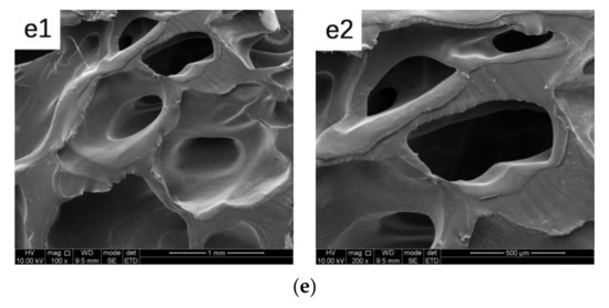 Scanning electron microscopy (SEM) images of (a) PTMG/PEG 100/0 (a1 100×, a2 200×), (b) PTMG/PEG 75/25 (b1 100×, b2 200×), (c) PTMG/PEG 50/50 ((c1) 100×, (c2) 200×), (d) PTMG/PEG 25/75 ((d1) 100×, (d2) 200×), (e) PTMG/PEG 0/100 ((e1) 100×, (e2) 200×).
