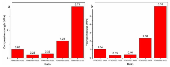 (a) Compressive stress (stain of 60%) and (b) Young’s modulus of PTMG/PEG porous scaffolds.