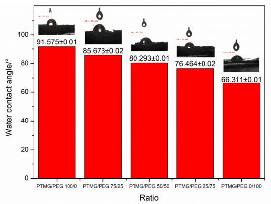 Water contact angle of PTMG/PEG porous scaffold materials with different ratios.